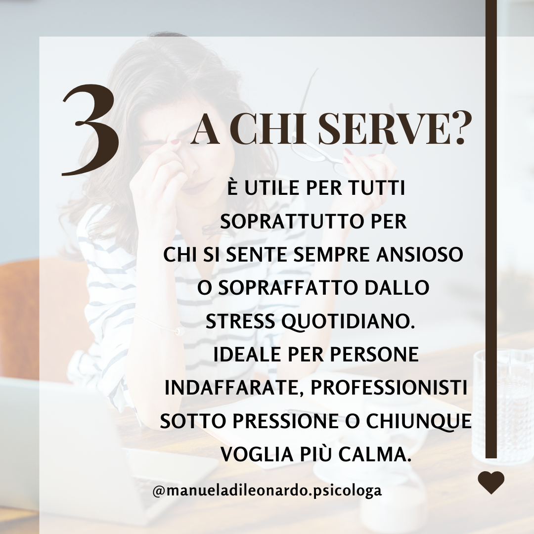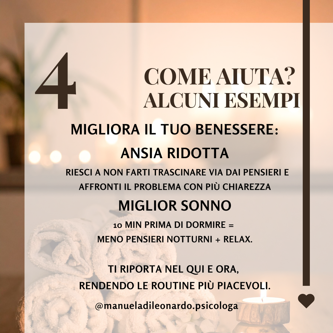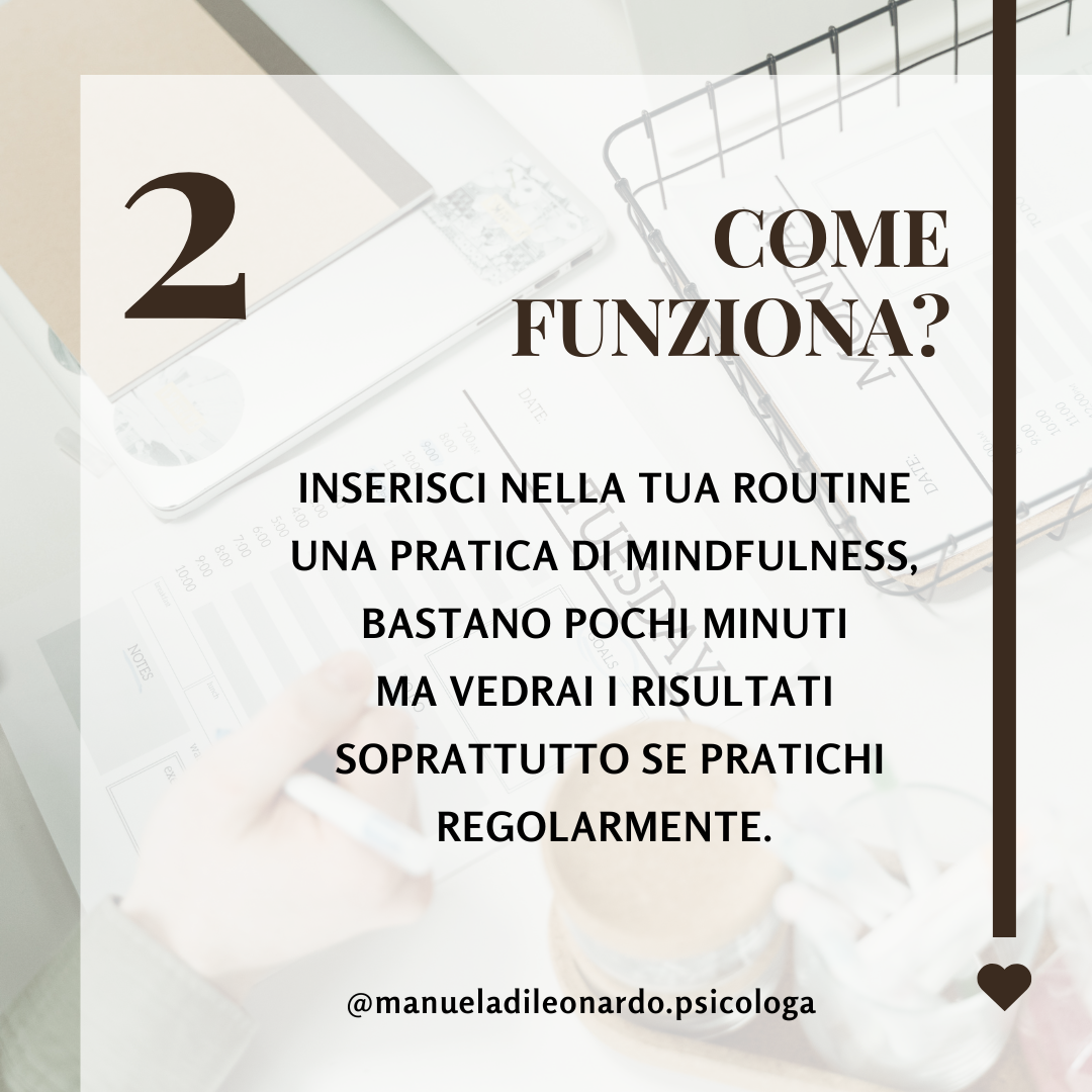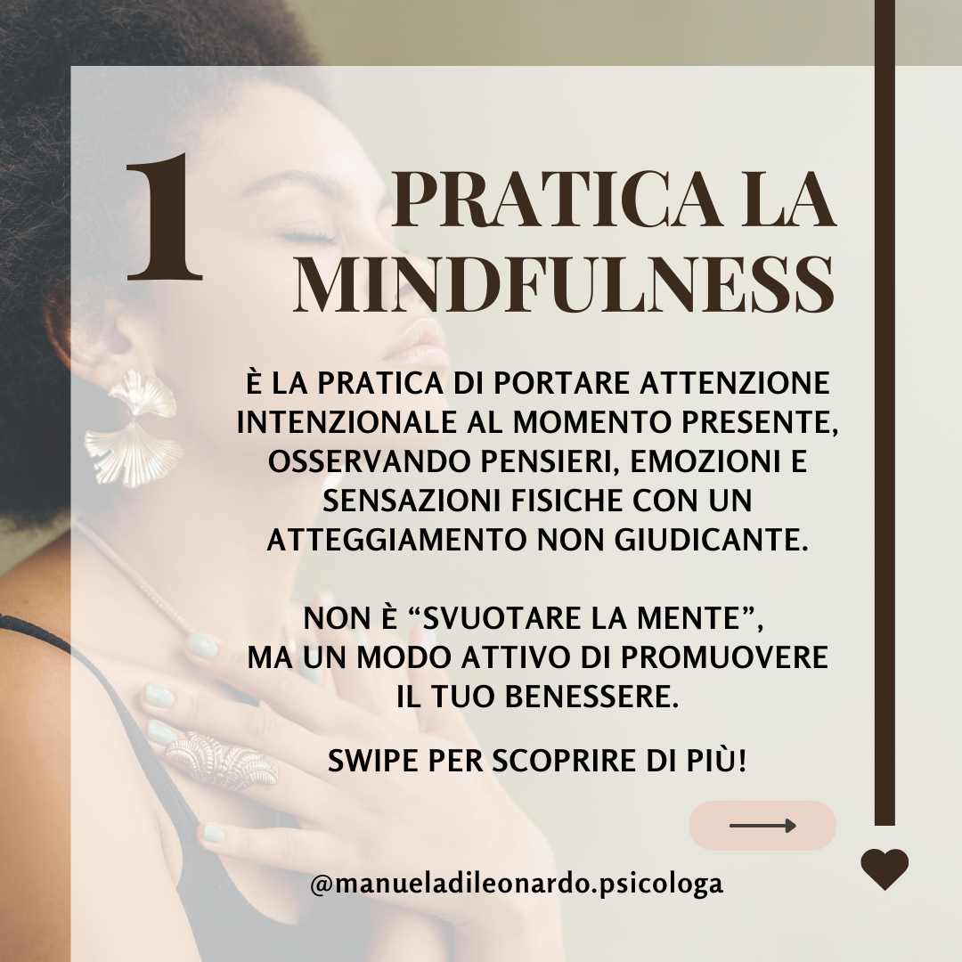 Scopri il potere della mindfulness con la guida esperta della Dott.ssa Manuela Di Leonardo. Le sessioni online in diretta ti offriranno una pratica efficace per migliorare la consapevolezza, ridurre lo stress e favorire il benessere mentale.